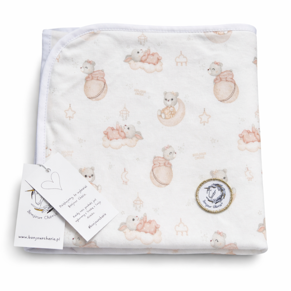 The Bonjour Cherie baby blanket, measuring 75×100 cm, is made of organic cotton, making it exceptionally soft, breathable, and safe for a baby’s sensitive skin. It is a thin, reversible blanket without filling, perfect for spring walks, warmer days, and everyday use.