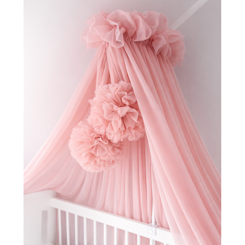 Szyfonowy baldachim do łóżeczka z pomponami – lekkość, która otula sen