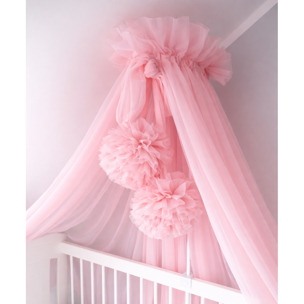 Szyfonowy baldachim do łóżeczka z pomponami Jasno Różowy