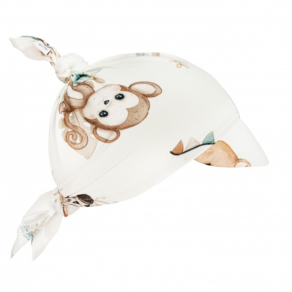 Wiązanie z tyłu pozwala na idealne dopasowanie do obwodu głowy i sprawia, że chustka „rośnie” razem z dzieckiem. Miękki daszek z przodu osłania buzię i oczka przed promieniowaniem słonecznym.