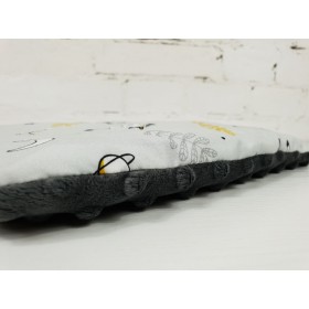 Płaska poduszeczka dla najmłodszych, wykonana jest z wysokogatunkowej bawełny 100%, którą z drugiej strony uzupełnia mięciutki plusz minky. Środek poduszki wypełniony jest antyalergiczną włókniną wysokopuszystą silikonową.