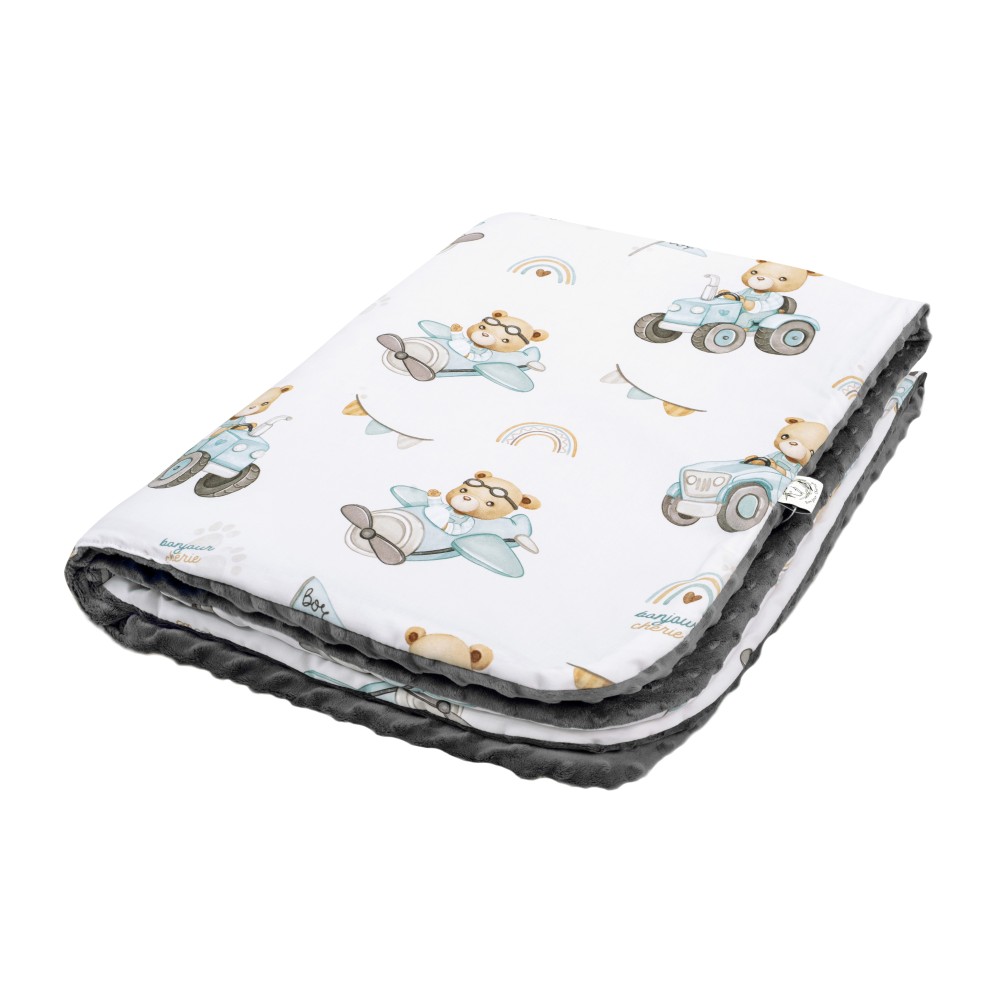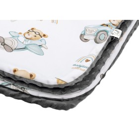 Kocyk wykonany jest z wysokogatunkowej bawełny 100%, którą z drugiej strony uzupełnia mięciutki plusz minky. Środek kocyka wypełniony jest antyalergiczną włókniną wysokopuszystą silikonową. Zapewnia ona dziecku ciepło oraz wygodę podczas użytkowania.