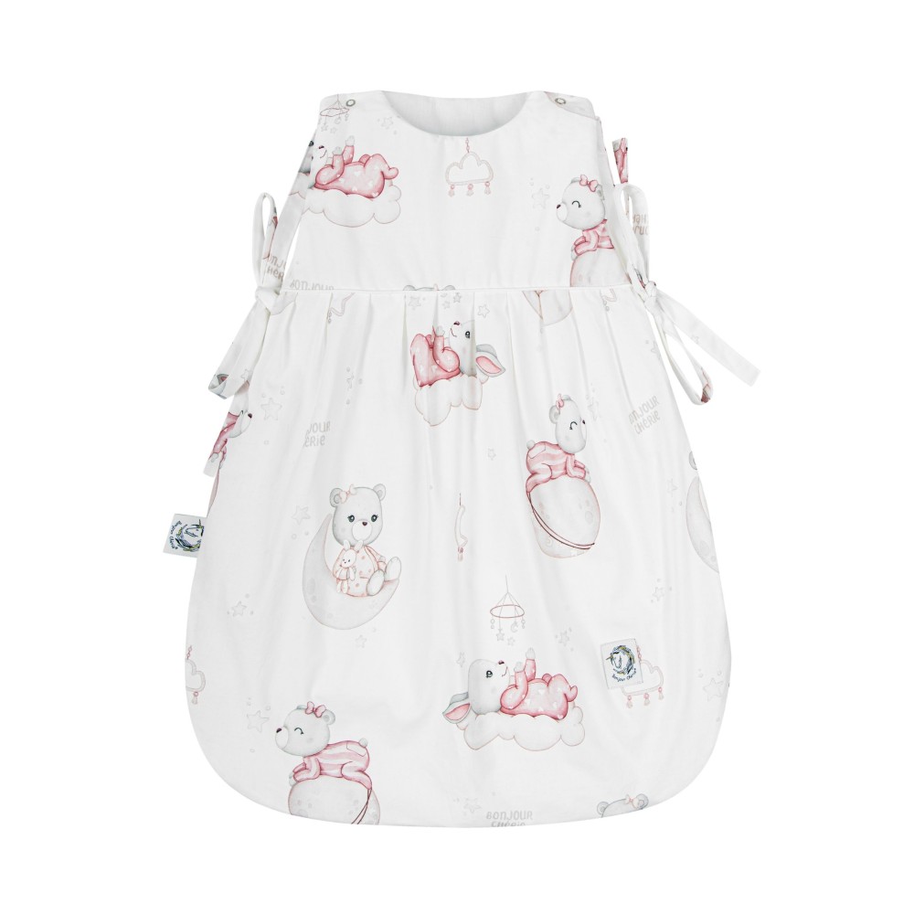 Śpiworek wykonany jest z miękkiej, oddychającej bawełny, która jest przyjazna dla wrażliwej skóry dziecka. Wypełnienie z antyalergicznej włókniny silikonowej zapewnia lekkie i przyjemne ocieplenie, idealne na chłodniejsze noce. Zasuwak na boku ułatwia szybkie ubieranie i przewijanie, a dodatkowe zapięcie na nap przy ramieniu zwiększa wygodę użytkowania.