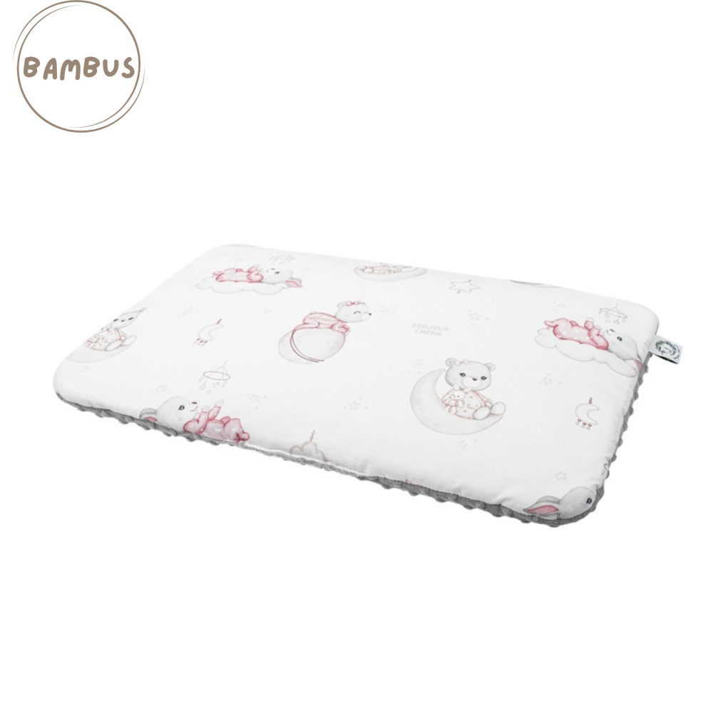 Płaska poduszka bambus–minky 25x30 cm Bonjour Cherie to miękka, antyalergiczna poduszka idealna do dostawki lub wózka, do domu czy przedszkola.